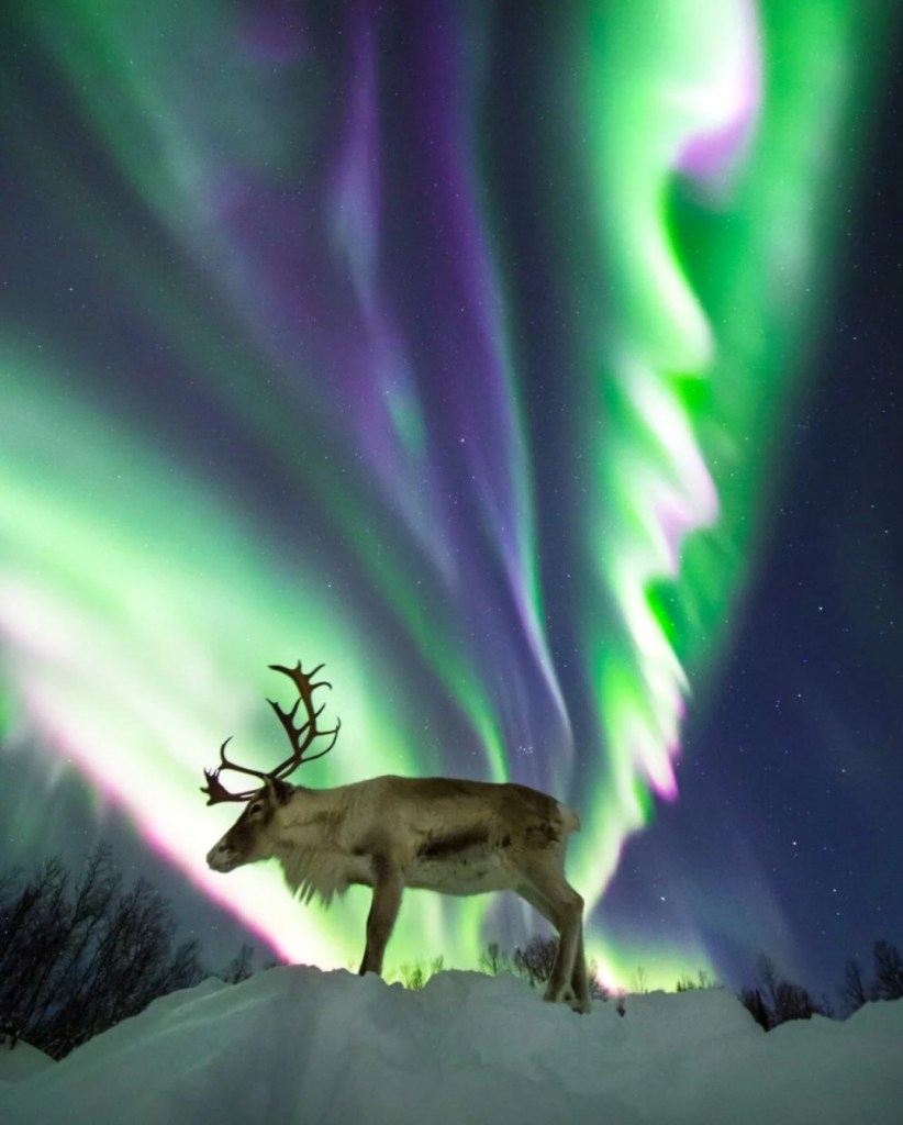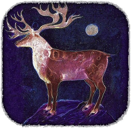 Soon Caribou’s pace quickens, and we are flying between the stars above and the stars reflected below. Slowly, I remember Caribou from another time, another life. As I do, I notice ragged strands of colored yarn, tiny bells, appear tied in Caribou’s antlers, around his strong neck. As they used to be.